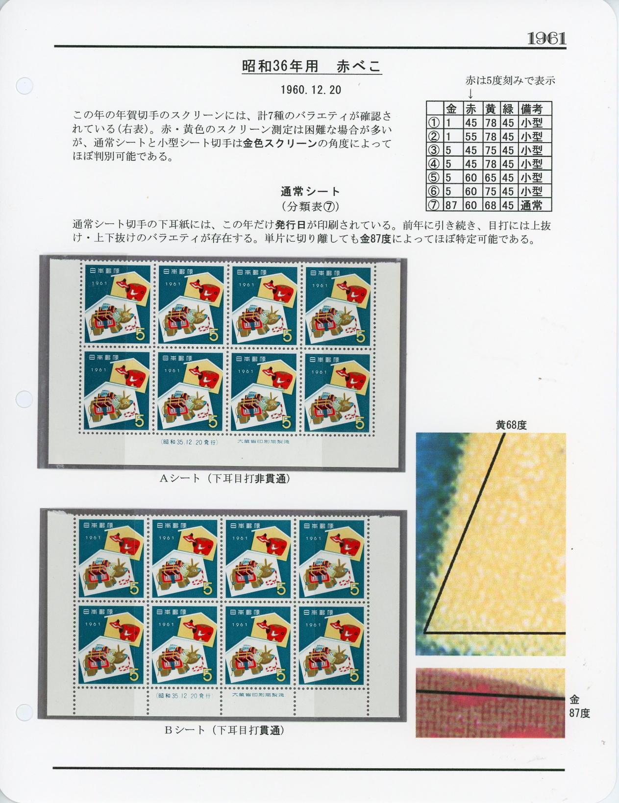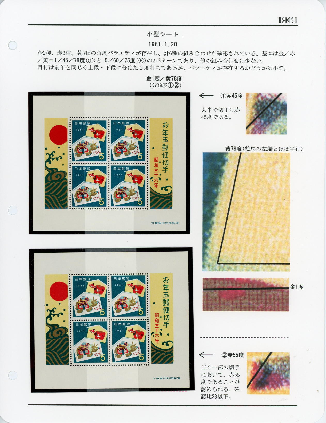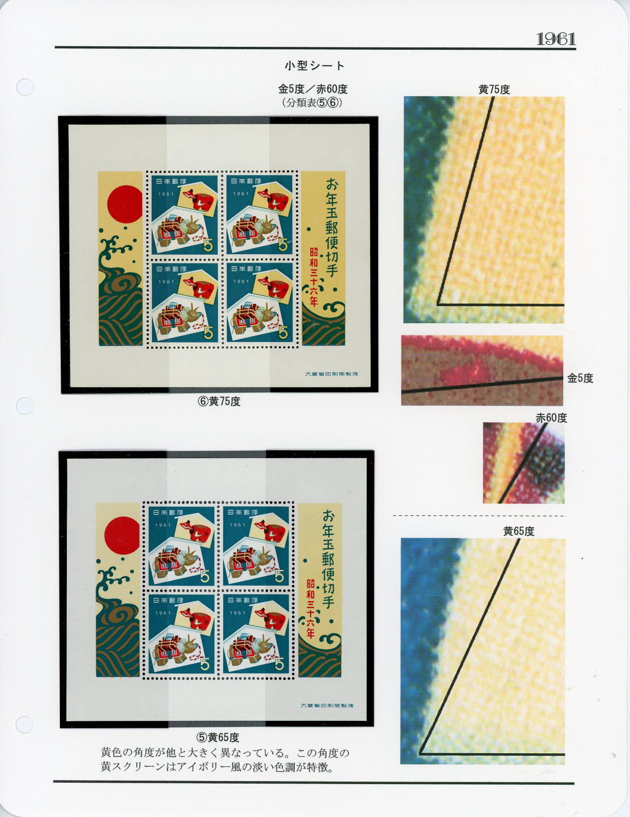 20面シート切手の未使用ブロックを小型シートと一緒に貼れば、製造面は1リーフでおしまい.....と思っていたこの時期の年賀切手でしたが、実はそうでありませんでした。一部の年の20面シートに目打バラエティがあることは現物をちょっと見ただけでわかりますが、一見全く同じに見える小型シートにも多くのバラエティのあることが、筆者自身の(たぶんオリジナルな)調査によって明らかになりました。グラビアスクリーンの角度バラエティです。