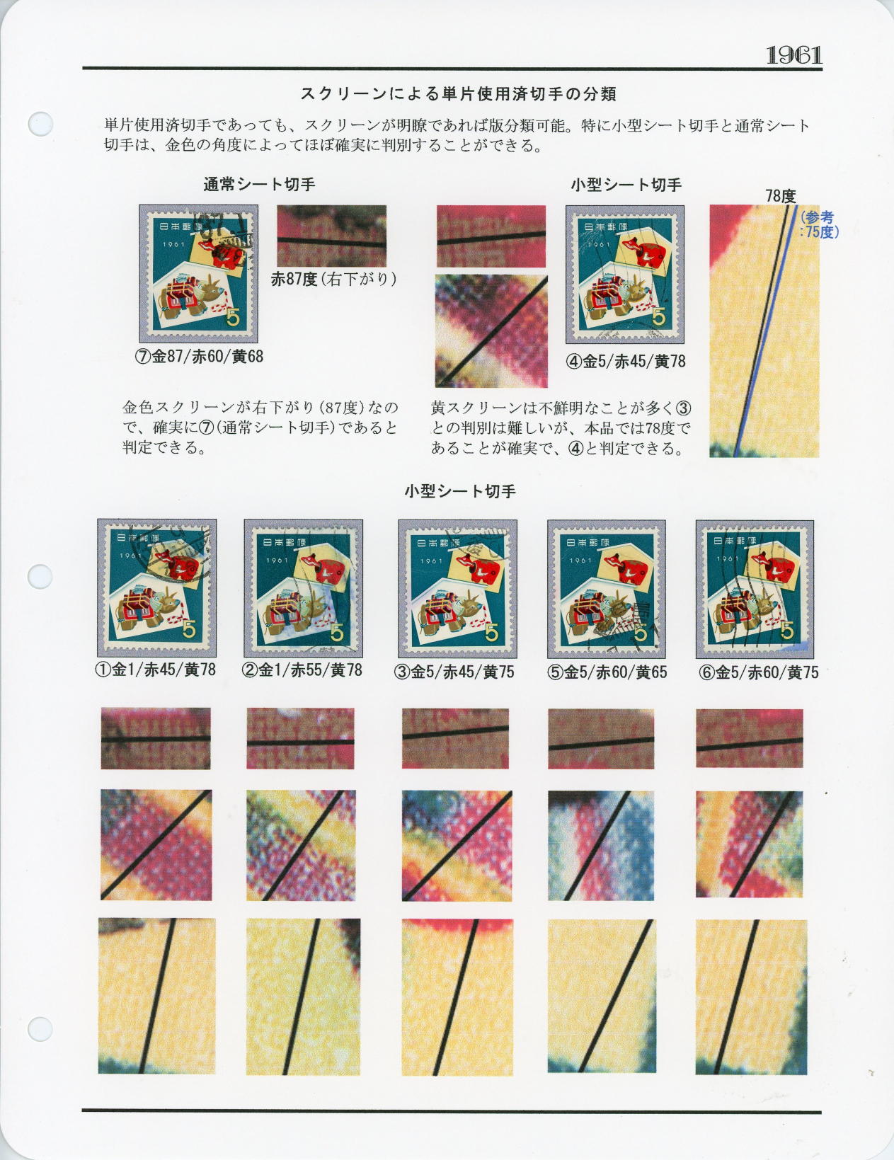 製造面のページがもう1ページあります。スクリーン角度によって、使用済単片切手を20面シートと小型シート全7種に分類したリーフです。20面シート切手は金87度(右下がり)だけでほぼ特定できます。右下がりか右上がりかを区別するだけで良いので、ルーペだけで20面シート切手を特定するのは難しくありませんが、小型シートの6種は条件が良くないと分類できません。100枚束を3つつぶして、鮮明なスクリーンを選び出しました。あくまでもスクリーン優先なので、消印はご覧のとおり見るべき要素がありません。このリーフ上でも、金/赤/黄=5/45/78(上段右側)については黄75度と78度のラインを重ねて、78度の角度であることをアピールしています。上の方でこの角度組み合わせの切手が2枚しか見つかってないと書きましたが、その2枚が4ページ目の小型シートとこの5ページ目の単片使用済です。