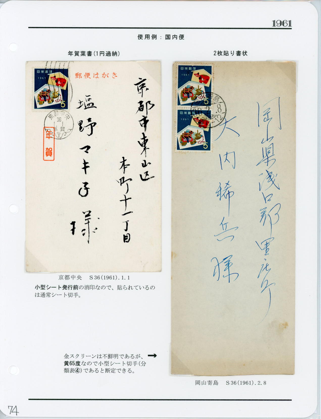 最後に、使用面のページもご覧に入れておきましょう(この分はJAPEX2024のときから変わっていません)。オフカバーの使用済切手を消印重視で貼ったリーフもあるのですがそれは省略して、カバーを2点ずつ貼ったリーフを2枚ご覧に入れます。6ページ目が国内あて、7ページ目が外国あてです。国内便は定型のパターンですが、1枚貼り年賀葉書と2枚貼り封書です。年賀葉書は当然20面シートの切手貼りですが、2枚貼り封書の方は日付が2月8日なので、昔ならばどちらか不明と片付けられたところでしょう。しかしスクリーンを調べれば判別できます。ここに貼った切手は金色が全くつぶれていますが(ということは5度の可能性大)、黄色が65度なので金/赤/黄=5/60/65の小型シート切手であることが特定できます。画像ではわかりにくいですが、この黄65度もクリーム色です。本来ならこの切手についてスクリーンの拡大図をつけておきたいところですね。