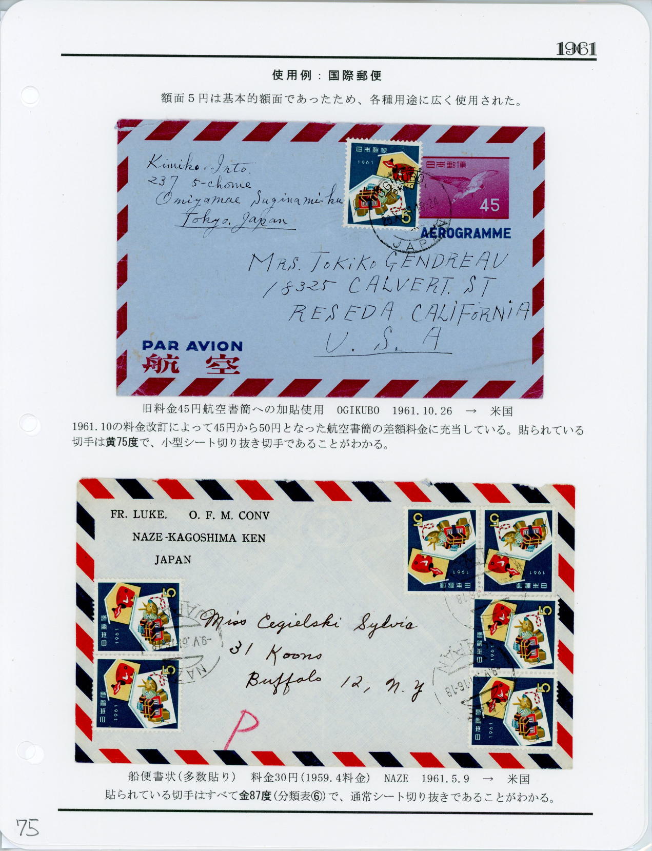 使用面では、絶対にこれが必要というようなものはなさそうです。上の2リーフにつけ加えるとすれば、国内便では2枚貼りの第5種便や速達・書留などの混貼特殊扱い便でしょうか。1961年6月の料金改訂前は速達料や書留料に5円の端数がついていたため、その端数に充当した使用例が考えられます。期間が短かったのでやや難しいかもしれません。外信便では5円の端数が着いた航空便料金がいくつかあって、それらに有効使用された例が考えられます。しかしこれらは、なければないですむ程度のものでしょう。