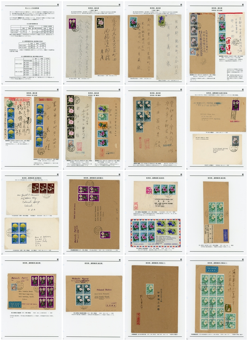 第2フレームはカバーだけで構成しました。シリーズ発行中に郵便料金の改訂(国内:6月1日、国際:10月1日)があったため、それらの前後で使用形態に多少の違いがあります。最初に料金表を載せました。ただし国内封書料金は10円のまま維持されたため、シリーズの額面もすべて10円です。国内封書にほか、単位額面切手としての使い方には変化がありません。 まずは基本となる国内封書ですが、12種中4種を貼りました。適正使用例としてですから、こういう作品には全12種の適正使用例を貼るべきだという考え方もあるかと思いますが、教科書的にそれらをずらずら並べるのは退屈な感もあります。スペースの兼ね合いもあって、4種だけにしました。 それに続いて多数貼りの速達便、書留便を2リーフずつ示しました。6月1日の料金改訂前と後とをそれぞれ含みますが、思い通りになってない部分が少しあります。「あさがお」3枚+5円普通貼りの速達葉書は、料金改訂前の3枚貼りに差し替えたいところです。「さざんか」5枚貼りの大型封筒は、書留扱いの5種便です。 国際郵便については、船便、航空便、沖縄あての順に配置しました。1枚貼りの船便印刷物は料金改訂前のみです。船便書状は3、4、5枚貼りを1点ずつ。5枚貼りは横向きに貼ってあるのが少々目障りですが、料金改訂前の重量便です。続いて航空便としては40円、100円、75円料金ものを貼りました。40円料金航空便にマテリアルの重複(第1地帯あて航空便書状)があるのが少々目障りですね。 最後の沖縄あてはたまたま「やまゆり」だけになってしまいましたが、1枚貼り船便(国内第5種便同額)と、17枚+5円貼りの重量航空便です。 |