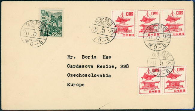 チェコ宛の24円料金の船便封書に、5枚の多宝塔を20円普通切手とともに貼ってあります。発行翌日の差し立て、6枚の切手をきれいに見栄え良く貼ってある点など、収集家差し出しの雰囲気があふれていますが、封筒の姿それ自体は自然な姿をしています。