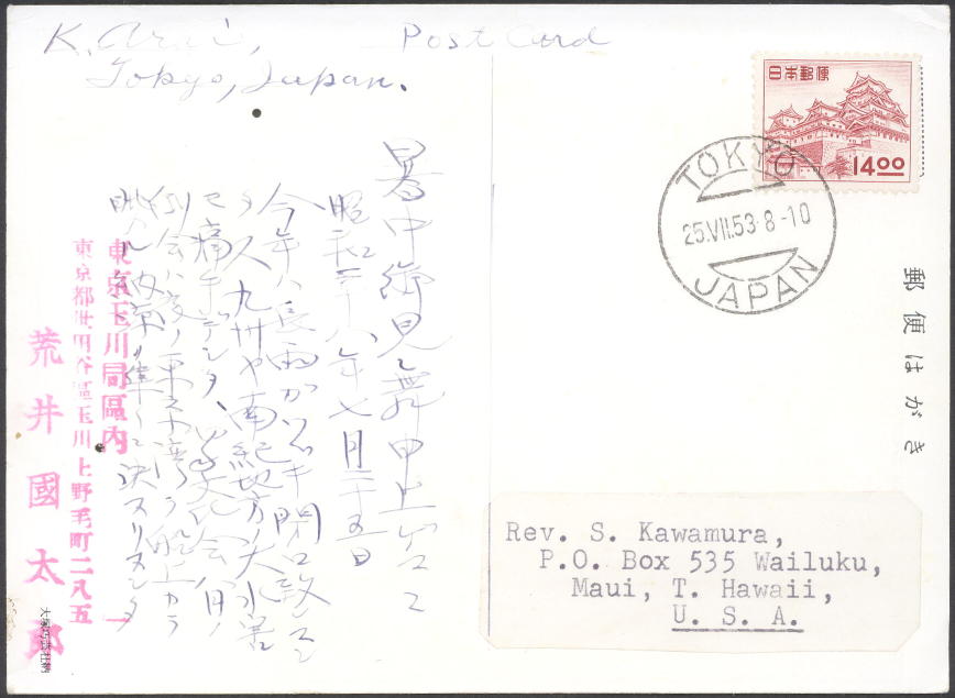 船便葉書 TOKYO 1953.7.25 → 米国(ハワイ)