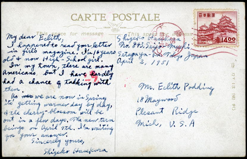 差し立ては昭和26(1951)年4月4日ですが、これは14円姫路城発行の1週間後という初期使用となっています。千歳局のある東京都世田谷区はまあ都会ですから、外国郵便用のこの切手も、初日から販売されていたに違いありません。、