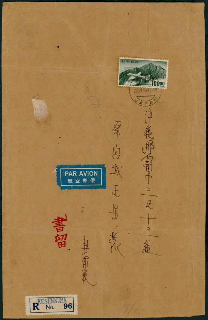 沖縄あて6倍重量航空印刷物便(書留扱い) KESENNUMA 1959.6.26