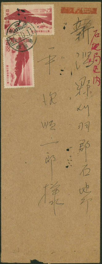 石地局の到着印は、封筒裏面に押されています。東京・新潟間の速達便なのに2日かかっていますが、当時の交通事情を考えればそんなところでしょう。引受印、到着印とも鮮明に押されているのは気持ちよいものです。普通切手代わりに大量発行されたこの切手の場合、昭和20年代後半から30年代の使用例が多い中で、切手発行年の昭和24年内に使用されたものである点も嬉しくなります。本当の名品というほどのものではありませんが、コレクションに加えておく価値は充分ある品といってよいでしょう。