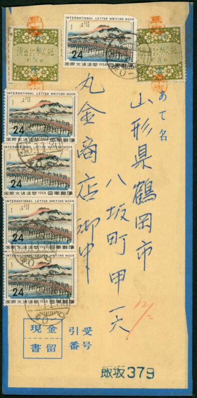封筒裏面には、差出人として福島県飯坂温泉駅前のお土産屋さんの名前が書かれています。店で売る商品の代金を、この現金書留便で送金したのでしょう。切手を貼ったのが差出人なのか窓口の局員だったのかははっきりしませんが。後者だったという気がしてなりません。国際郵便料金が1959年4月に改訂されて、24円切手の用途が用途が消滅して1年以上経ち、売れ残っていた24円切手を持てあましていた時期です。別納でつぶした例も多く見られますが、窓口で受け付ける高額郵便物に貼って消化した局も多かったと推察されます。たまたまお客のもち込んだ現金書留便がちょうど120円料金となったので、まとめて5枚消化することが出来たということでしょう。